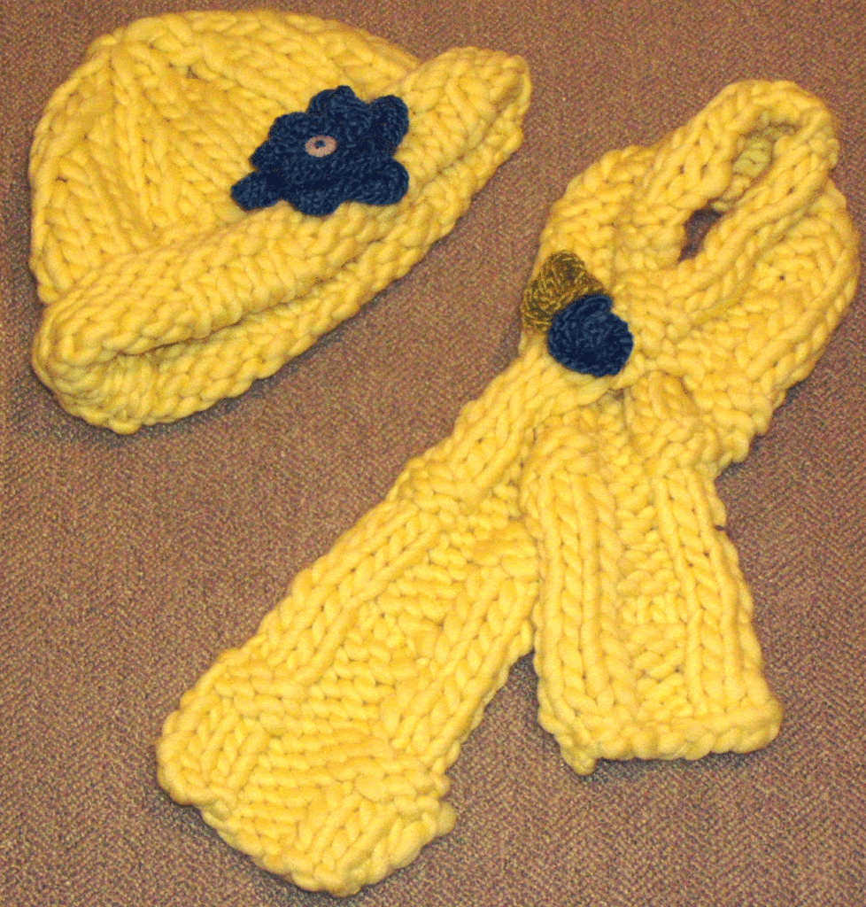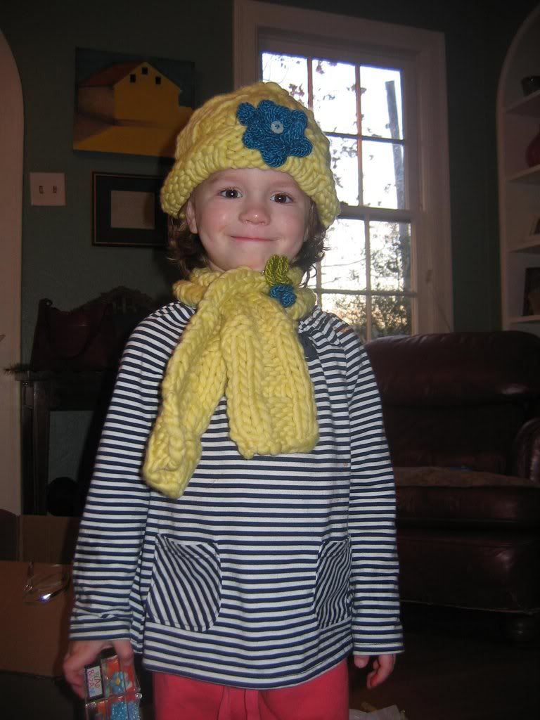 Got some twinkle yarn my last visit to Dallas. I made this beanie and scarf in a flash, then added some knitted flowers as an embellishment.