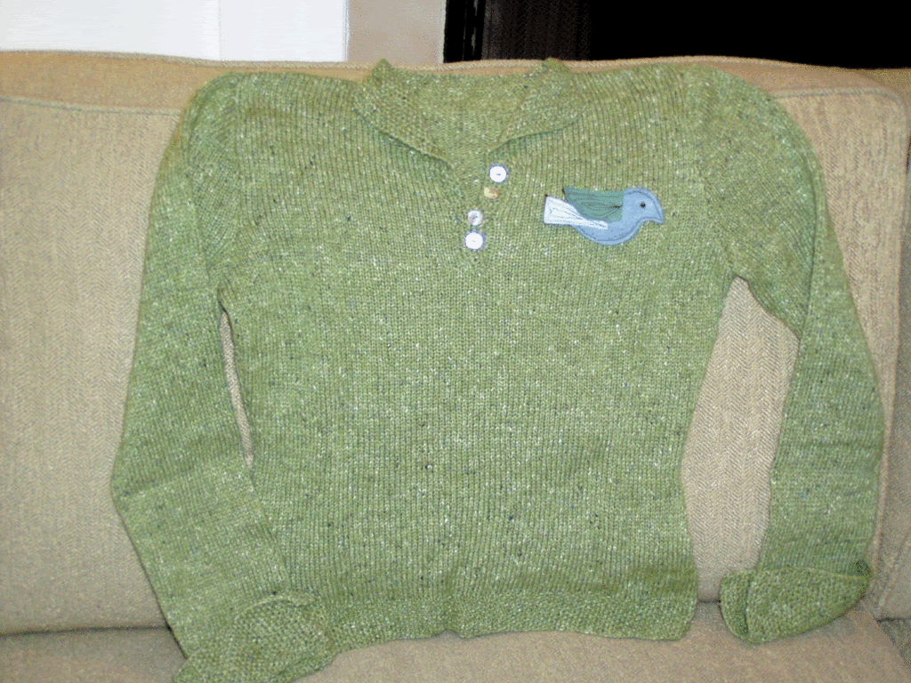I've failed to update the blog in a while. Now I've got some catching up to do. This is a nice fitted French ingenue-esque pullover in Rowan Felted Tweed herb. The pattern is called Salina by Kim Hargreaves from Vintage Knits. I love the little bird pin I picked up from the farmer's market. Hope you like it sis!